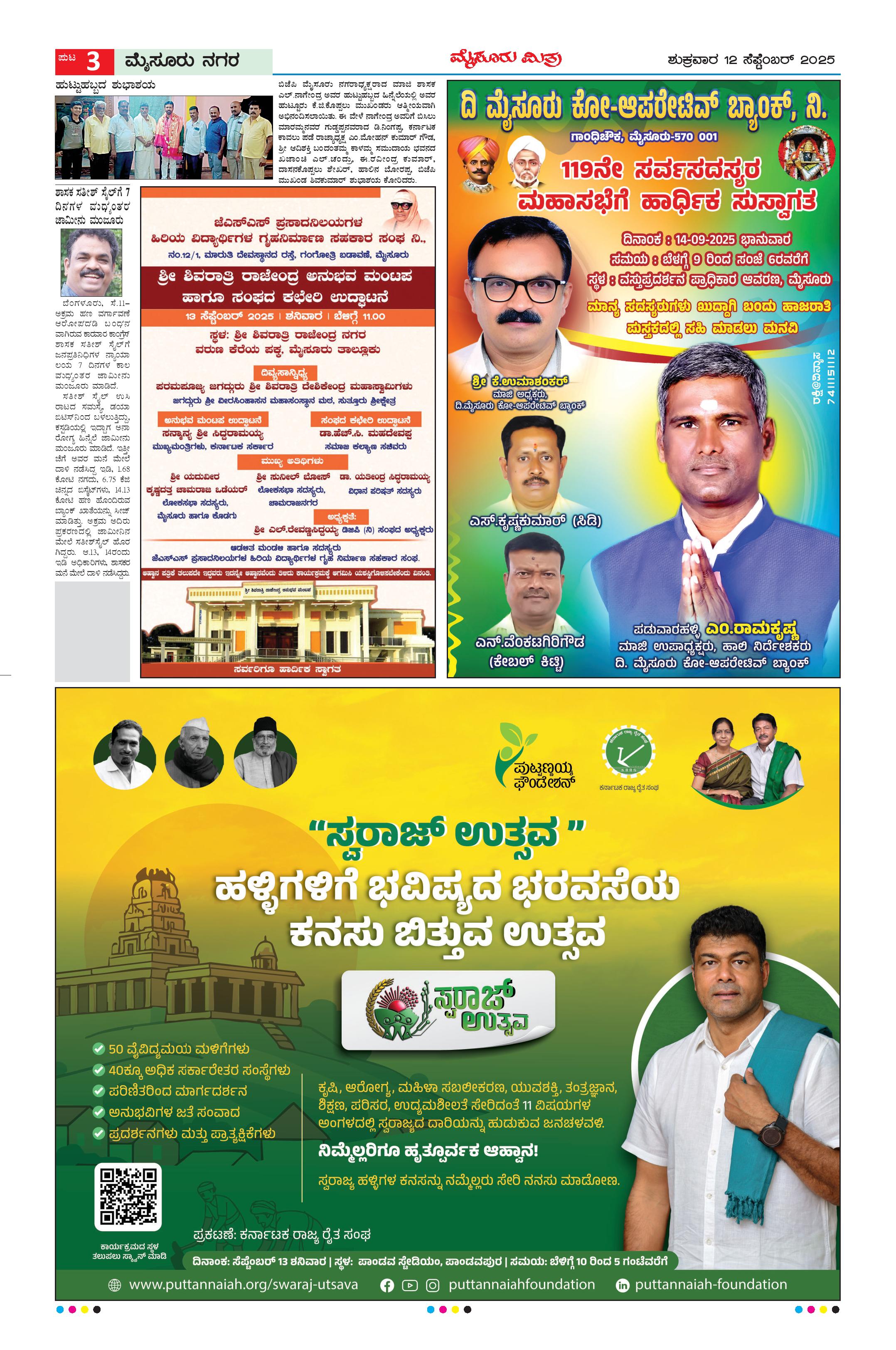 Mysuru Mithra Page: 3 September 12, 2025 << First << 3 >> Last >> Page 1Page 2Page 3Page 4Page 5Page 6Page 7Page 8Page 9Page 10Page 11Page 12 × Mysuru Mithra << First << 3 >> Last >> Page-1Page-2Page-3Page-4Page-5Page-6Page-7Page-8Page-9Page-10Page-11Page-12