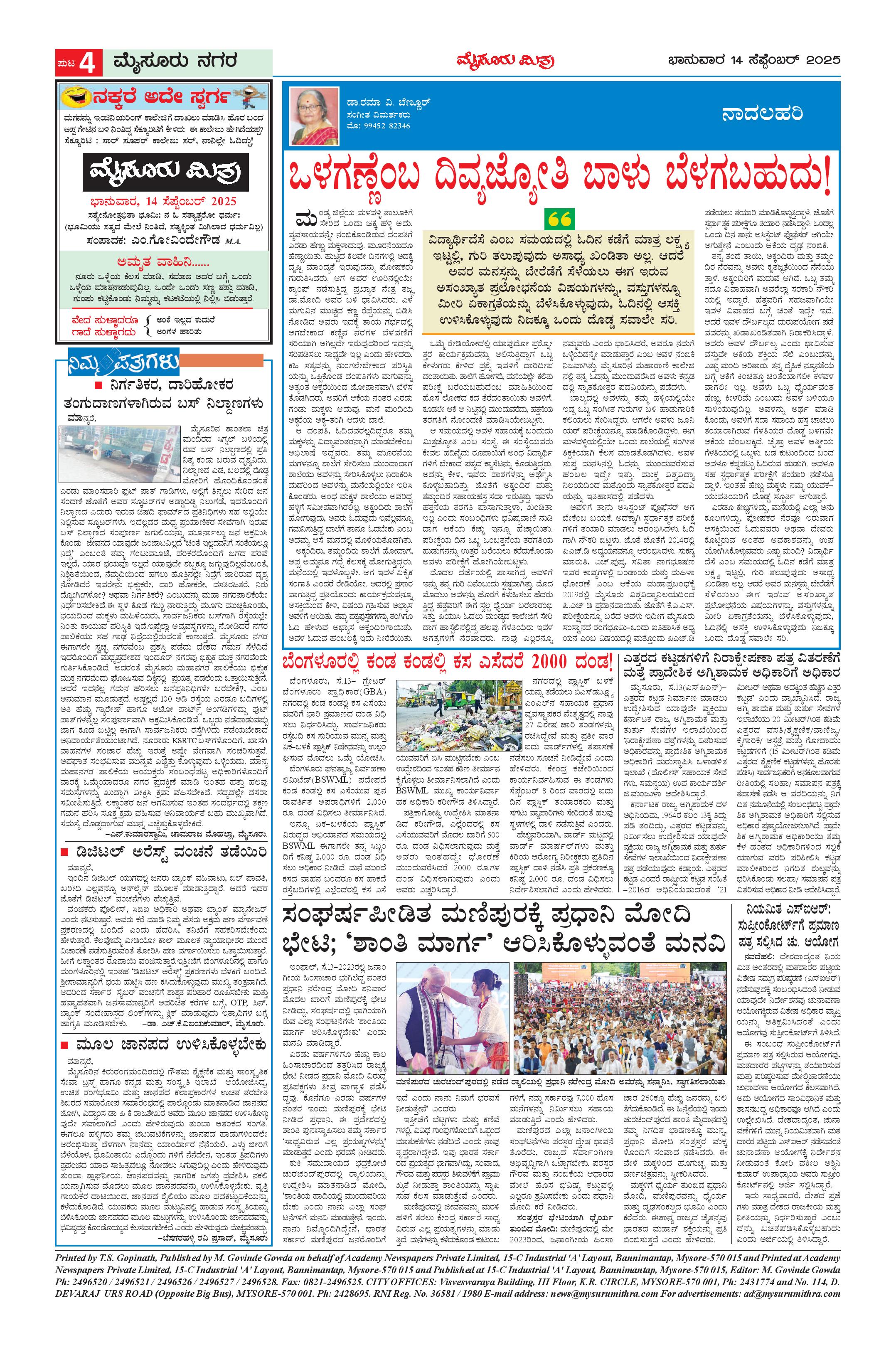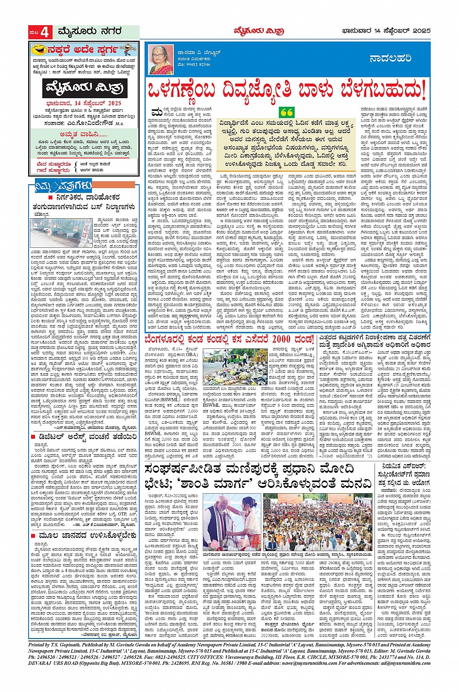 Mysuru Mithra Page: 4 September 14, 2025 << First << 4 >> Last >> Page 1Page 2Page 3Page 4Page 5Page 6Page 7Page 8Page 9Page 10Page 11Page 12 × Mysuru Mithra << First << 4 >> Last >> Page-1Page-2Page-3Page-4Page-5Page-6Page-7Page-8Page-9Page-10Page-11Page-12