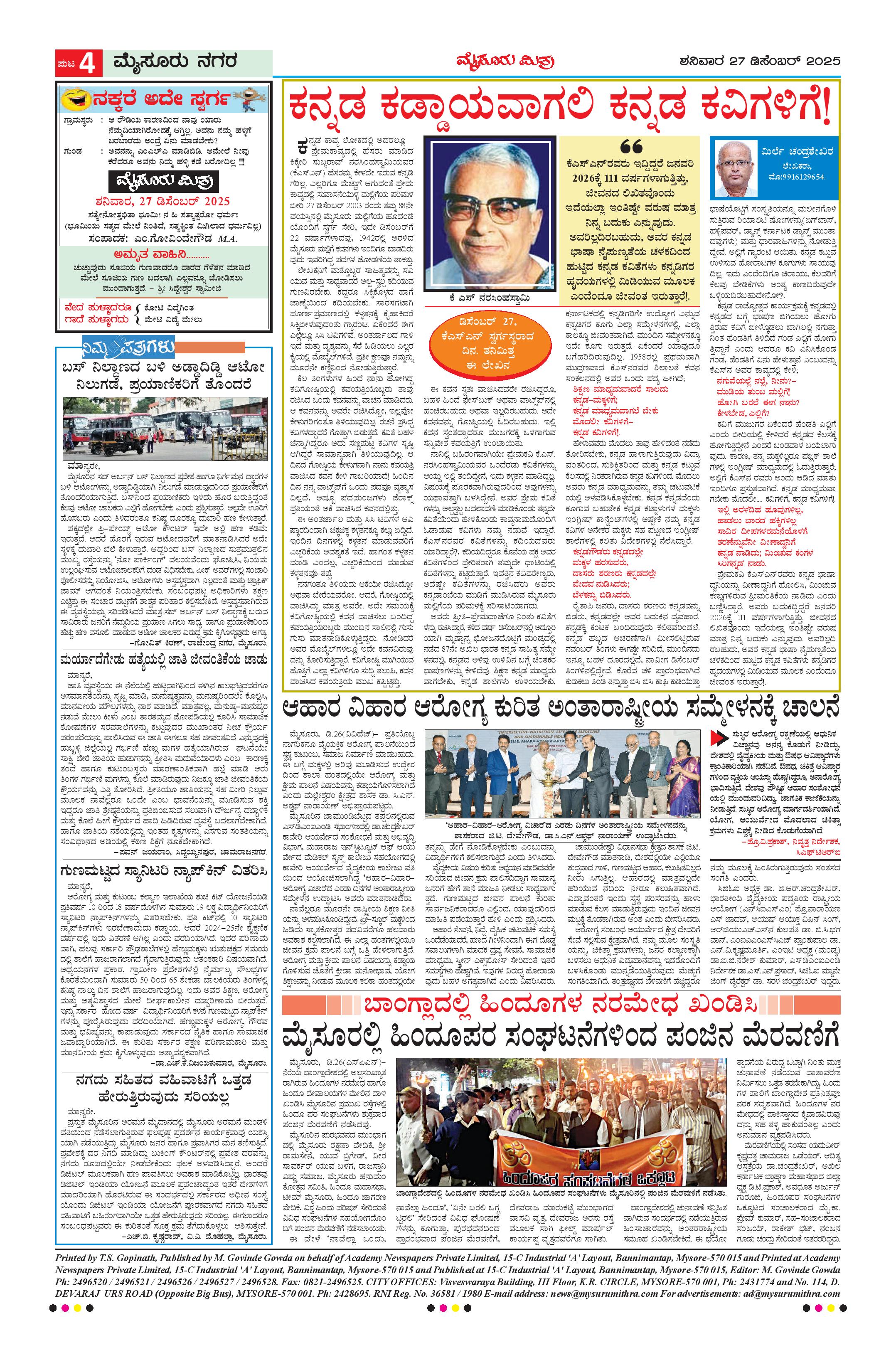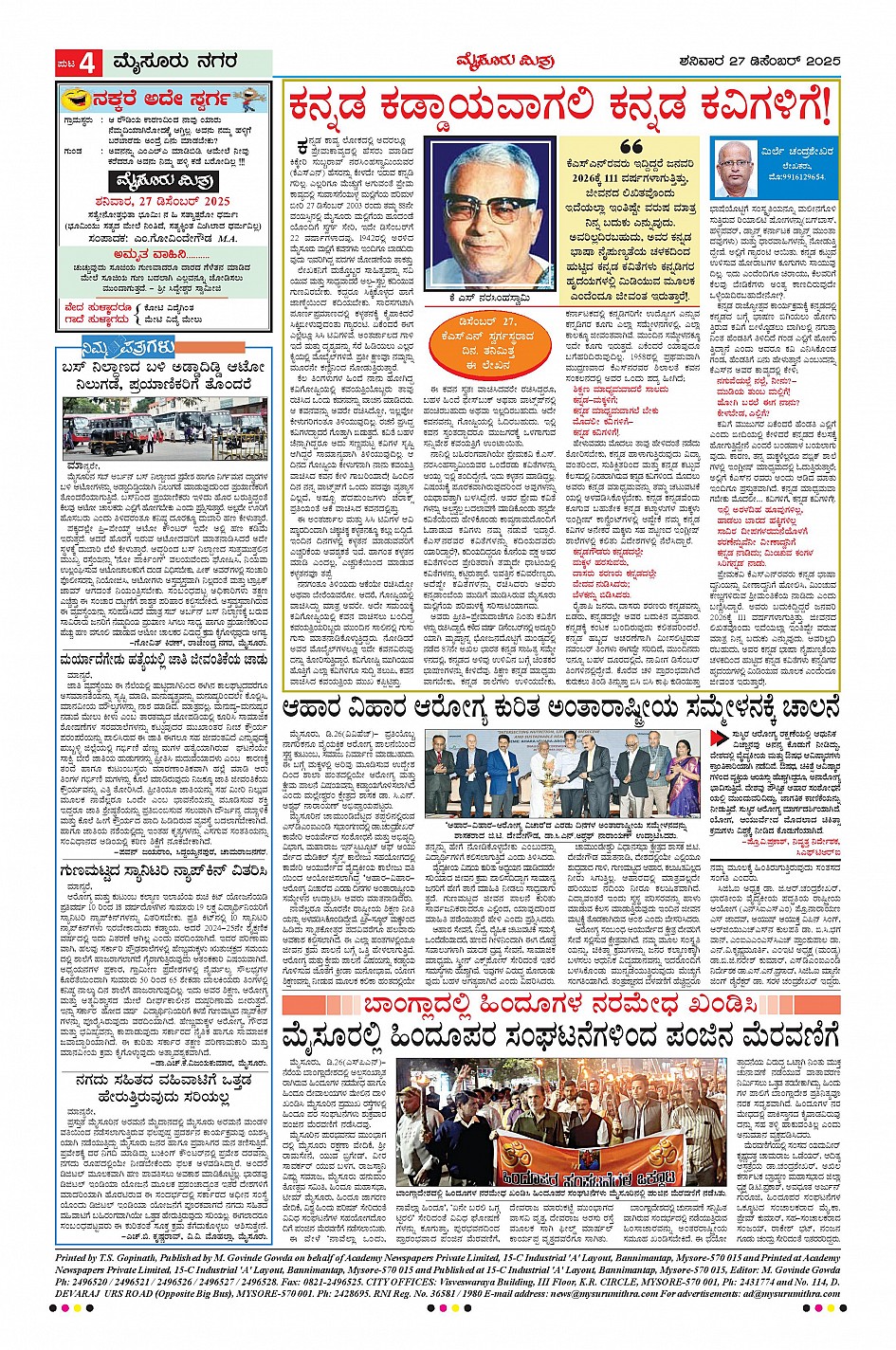 Mysuru Mithra Page: 4 December 27, 2025 << First << 4 >> Last >> Page 1Page 2Page 3Page 4Page 5Page 6Page 7Page 8Page 9Page 10Page 11Page 12Page 13Page 14Page 15Page 16 × Mysuru Mithra << First << 4 >> Last >> Page-1Page-2Page-3Page-4Page-5Page-6Page-7Page-8Page-9Page-10Page-11Page-12Page-13Page-14Page-15Page-16